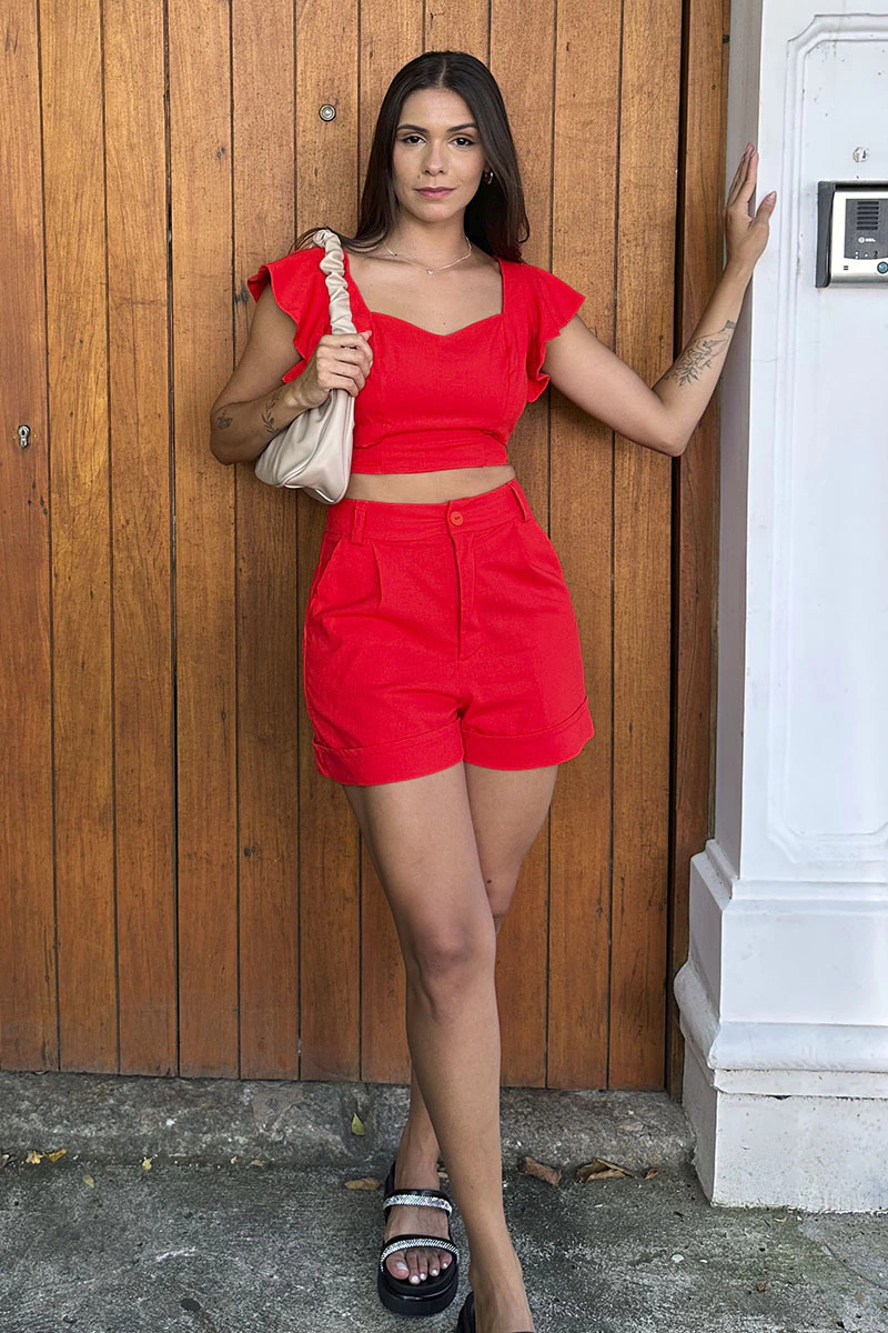 Nossa bermuda alfaiataria é um clássico e contemporâneo com comprimento médio, perfeito para todas as ocasiões. Possui bolso faca e pregas na frente, além de passador no cós, botão e zíper para fechar. Não possui bolso traseiro, apresentando uma silhueta elegante e minimalista.