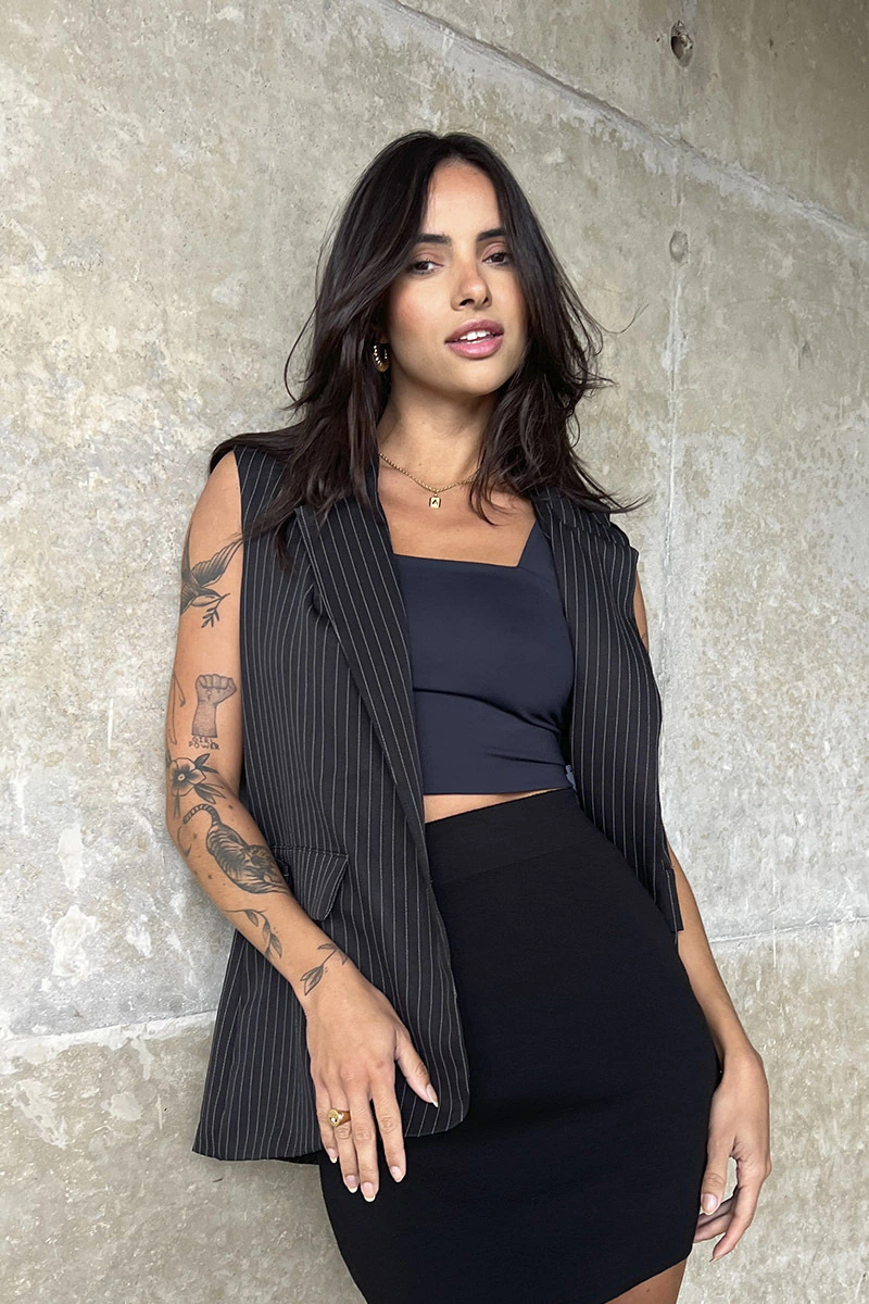 Blazer colete em risca de giz, confeccionado em alfaiataria. Possui corte alongado, acinturado e estruturado, proporcionando um visual elegante e sofisticado. O design inclui um botão e bolso fake, adicionando versatilidade ao estilo. Este colete é a escolha perfeita para destacar sua presença em qualquer ocasião.