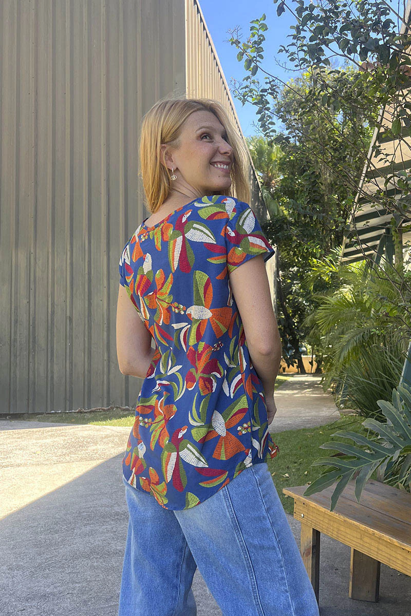 Nossa blusa de manga curta com cumprimento alongado, corte evasê e decote alto é uma peça que combina elegância e conforto. Uma peça versátil que é facilmente combinada com várias peças de estilo mais casuais a um estilo mais formal.