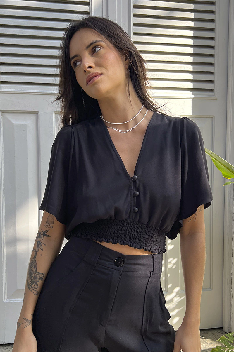 A blusa com lastex na cintura é a peça perfeita para quem busca conforto e sofisticação. Possui decote em V com detalhe em três botões. As mangas estilo morcego acrescentam um toque de modernidade e frescor, tornando-a ideal para diversas ocasiões, desde um passeio descontraído até um evento mais formal.