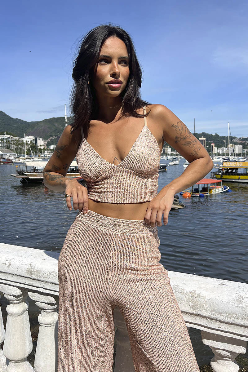 Nossa Calça Pantalona de paetê é a peça que promete realçar sua beleza de uma forma única! Com cintura alta e um brilho que encanta, você vai amar como essa calça se ajusta ao seu corpo, trazendo conforto e elegância.Possui ziper invisível na lateral, o que facilita o vestir, e permitindo que você se sinta à vontade e pronta para qualquer ocasião. Imagine-se em uma festa, irradiando confiança e estilo!