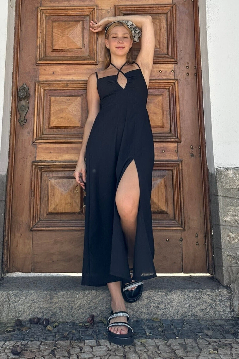 Um vestido que se adapta a você! Confeccionado em linho, ele conta com alças ajustáveis, lastex nas costas para um caimento perfeito e tiras versáteis para diferentes amarrações. A fenda frontal traz leveza e movimento, combinando conforto e sofisticação em uma peça única.